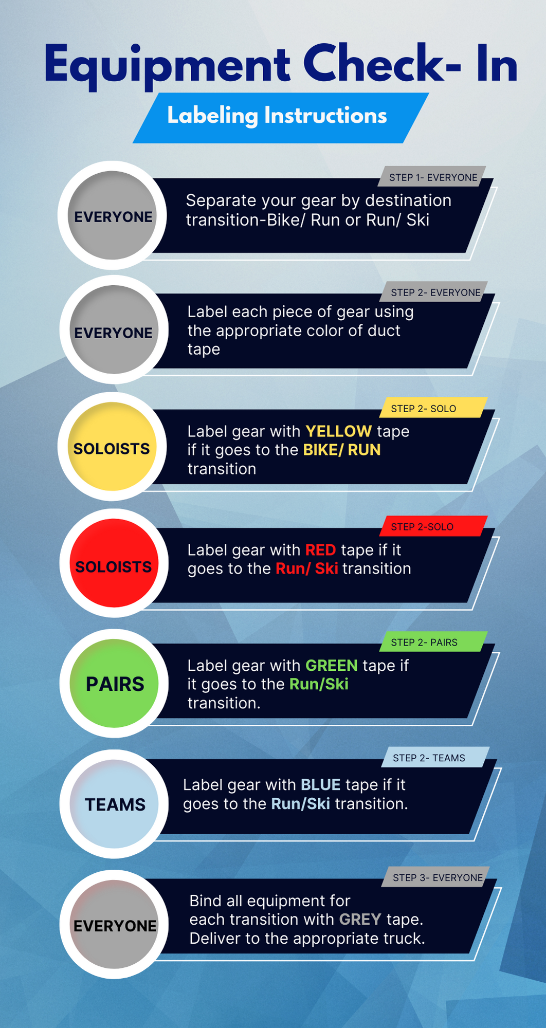 All equipment should be clearly marked with your color-coded race number, including any items that will be separated from you during the race (bike, helmet, running shoes, poles, snowshoes, ski boots, backpacks, gloves, hats, jackets, bags of clothing or food).